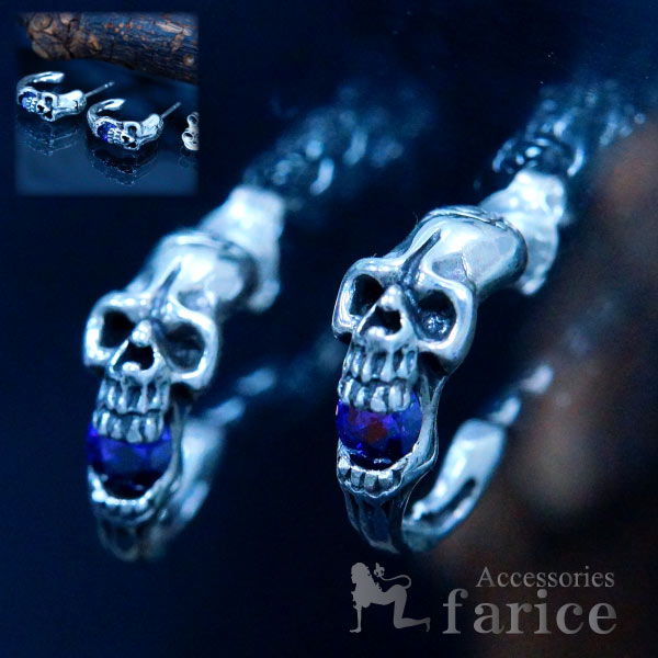 スカルの顔をそのままハーフムーンの形にした個性的なデザインで、ゴージャスな石の輝きも加えられたシルバースタッドピアスです。スカルの姿が剥き出しとなったフォルムは、通常の彫り模様を使ったデザインと比べやはりそのインパクトが違いますね。ゴツゴツとした形状と無機質な姿を捉えた彫りが、凶悪なスカルのイメージを上手く表現しています。スカルの頭上にはスクリュー状のトライバル紋様が彫り込まれており、如何にもハード系アクセらしいイカつさを感じられるデザインになっています。口元には紫の色彩を持つアメジストが装飾されており、ロイヤルパープルの美しい光彩を見せるその姿は、まるで妖気を放つかの様な妖艶な雰囲気が漂っています。