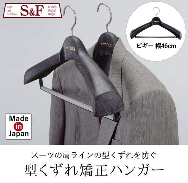 スーツの肩先に合わせた厚みと曲面で受け止め、肩のラインの型くずれを防ぐ、型くずれ防止ハンガーです。