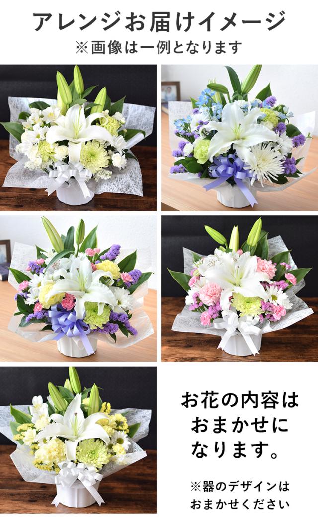 【内容】お供え生花アレンジ:百合、季節のお花、グリーンなど/リボン/ラッピング/バスケット