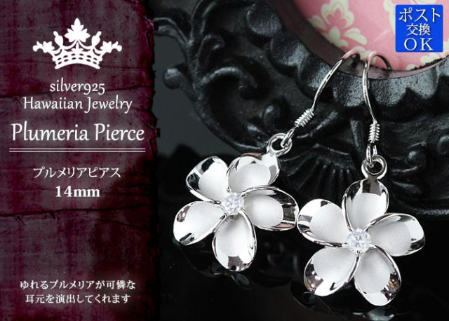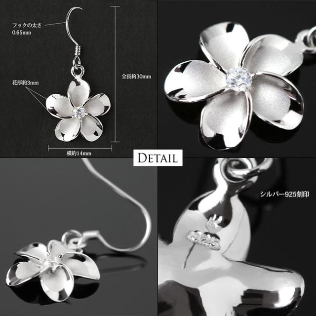 ハワイアンジュエリー ピアス プルメリアピアス 花 14mm ジルコニア シルバー925 ロジウムコーティング フックピアス 揺れる ぶら下がり 金属アレルギー対応 樹脂フック イヤリングにパーツ交換可能 お正月 成人祝い 【品番:SE53848】