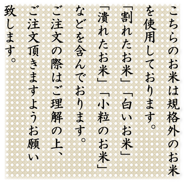 規格外の米になるため「小粒」「白い米」「割れた米」「潰れた米」 など非常に多く含んでおります。