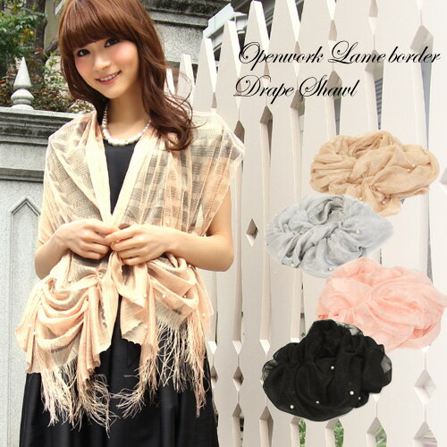 パール付き透かしボーダー編みシャーリングショール