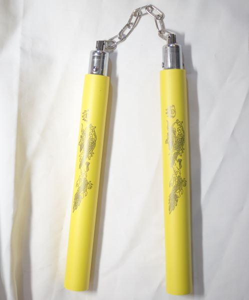 カンフー武具・イエロー ウレタン ラバー ヌンチャク【ソフトラバー製玩具】 龍模様 遊離ベアリング軸承リング使用