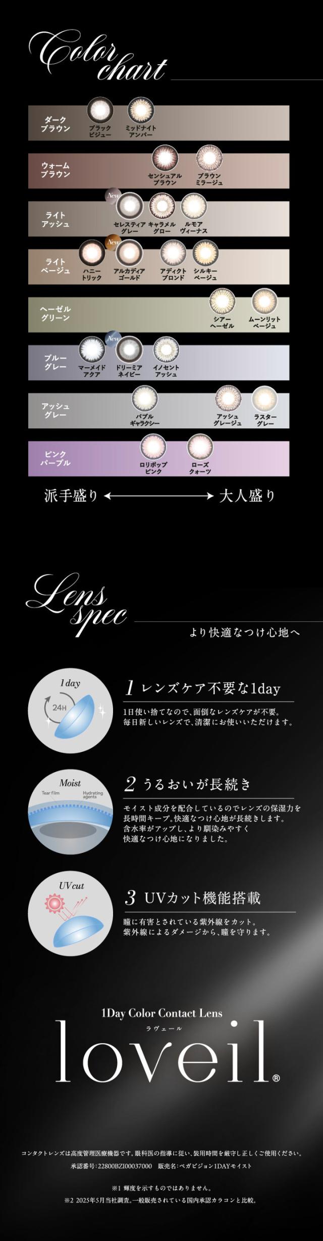 ※倖田來未プロデュース:ミッドナイトアンバー、シアーヘーゼル、キャラメルグロー、バブルギャラクシー、ロリポップピンク、ローズクォーツ、マーメイドアクア、ハニートリック