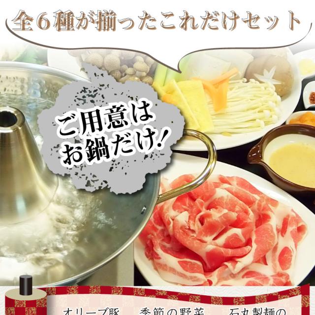 | 内容量 | オリーブ豚肩ロース300g、野菜盛り合わせ、タレ2種類、しゃぶもち4枚、だし用真昆布 2g、石丸製麺讃岐うどん 220g |