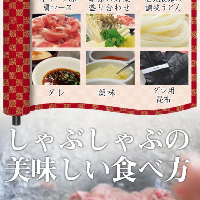 用意は鍋と水だけで本格派の豚しゃぶが楽しめます。贈答用としても大人気。ダシ昆布・野菜セット・タレ・お肉が、ぜ〜んぶセットになっているから、すぐに楽しめます。 用意は鍋と水だけで超簡単。作り方も入っているので、失敗なし。最後の〆の本場『讃岐うどん』も付いてるよ!豚肉には、コラーゲンとビタミンたっ〜ぷり ※北海道、沖縄は別途1000円かかります==================================================================【送料無料//お歳暮 御歳暮/ギフト/贈り物/贈答/祝い/記念/しゃぶしゃぶ/豚肉/国産/肩ロース/香川県】