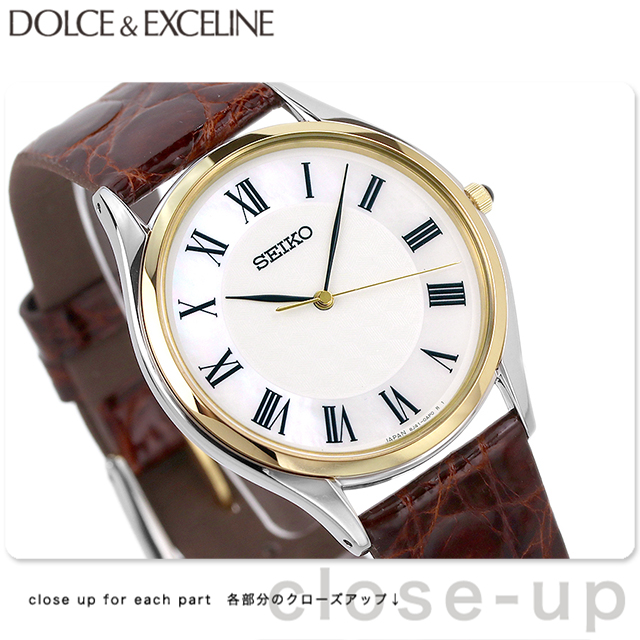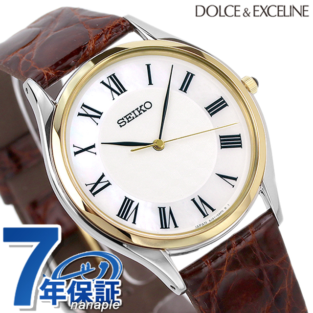正規品 7年保証キャンペーン 送料無料 SEIKO ドルチェ クオーツ ペアウォッチ メンズ SACM152 DOLCE&EXCELINE 腕時計 マザーオブパール×ブラウン レザーベルト ドルチェ&エクセリーヌは上品なドレスウォッチを展開するセイコーブランドです。スタイリッシュなデザインは、大切な人との時間を、自分らしさをスマートに演出します。 モダンでスタイリッシュな大人の男女に似合う、洗練されたデザインが特徴のペアシリーズ。ガラスには傷つきにくいだけでなく、輝きが良く透明度の高いサファイアガラスを採用。腕にフィットするシンプルな薄型ケースや、視認性に優れた質感の高いダイヤルデザインは、セイコーが長年培ってきたクオーツならではの技術です。