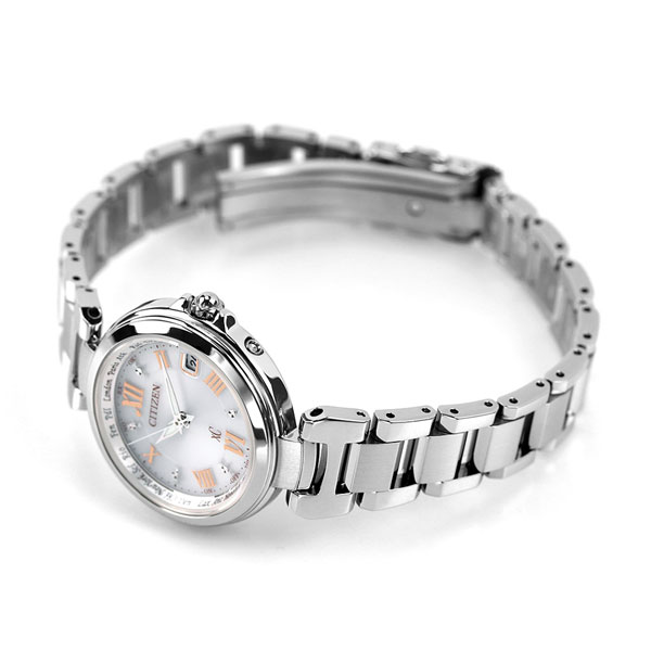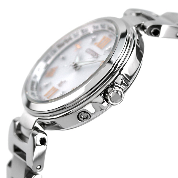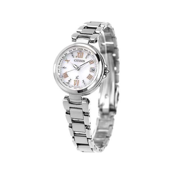 正規品 7年保証キャンペーン 送料無料 シチズン クロスシー ソーラー 電波時計 ハッピーフライト ホワイト CITIZEN xC EC1030-50A エターナルプラチナ ◆クロスシーは北川景子さんがイメージキャラクターのブランドです。2012年秋冬コレクションのデザインテーマは“シアター&ロマンス”。トレンドの「レトロ・モダン」をベースに、デイリースタイルでも合わせやすい艶やかなケースとブレス、レトロ感ある針デザインが特徴です HAPPY FLIGHT(ハッピーフライト) いつでも正確、時刻合わせの電波時計が、日本だけでなく、世界4つのエリア(日本・中国・北米・欧州)で標準電波を受信するので、例えばパリやロンドンなど海外でも正確な時刻を表示します。操作も簡単でりゅうずを一段引いて秒針を見返しリング内側にある都市に合わせるだけで、各都市の時刻・日付に変わる手軽さです。 見返しリングにはノスタルジックなフォントで24都市を表示。旅行に人気の都市はフル表記でアクセントにしているのもポイントです。 発売日:2012年10月発売