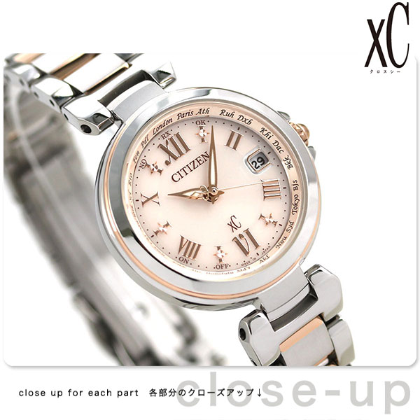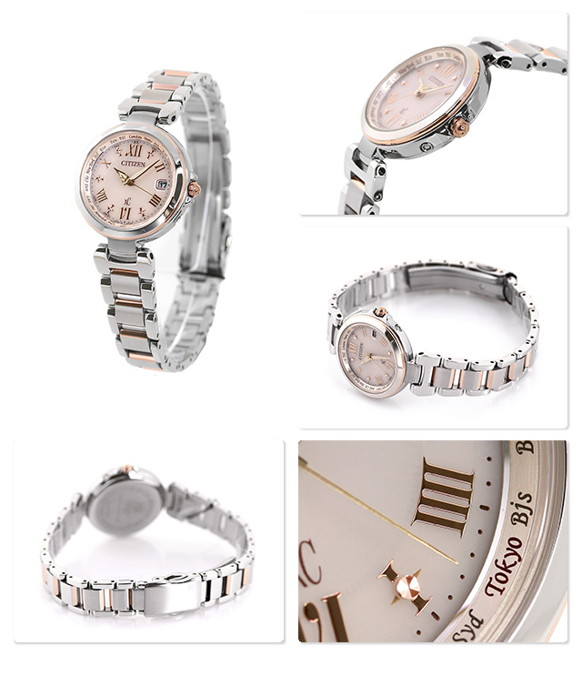 正規品 7年保証キャンペーン 送料無料 シチズン クロスシー ソーラー 電波時計 ハッピーフライト ピンク CITIZEN xC EC1034-59W 北川景子広告着用モデル エターナルプラチナ ◆クロスシーは北川景子さんがイメージキャラクターのブランドです。2012年秋冬コレクションのデザインテーマは“シアター&ロマンス”。トレンドの「レトロ・モダン」をベースに、デイリースタイルでも合わせやすい艶やかなケースとブレス、レトロ感ある針デザインが特徴です HAPPY FLIGHT(ハッピーフライト) いつでも正確、時刻合わせの電波時計が、日本だけでなく、世界4つのエリア(日本・中国・北米・欧州)で標準電波を受信するので、例えばパリやロンドンなど海外でも正確な時刻を表示します。操作も簡単でりゅうずを一段引いて秒針を見返しリング内側にある都市に合わせるだけで、各都市の時刻・日付に変わる手軽さです。 女性の腕に馴染みやすく、優しい雰囲気に仕上げました。見返しリングにはノスタルジックなフォントで24都市を表示。旅行に人気の都市はフル表記でアクセントにしているのもポイントです。 発売日:2012年10月発売