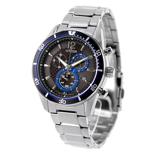 正規品 7年保証キャンペーン 送料無料 さりげないカラーがポイントのスポーティデザインクロノグラフが登場です。 オンでもオフでも着こなしやすいデザインのクロノグラフモデル。チェッカーフラッグ柄の入ったブラックダイヤルにポイントカラーを施し、スポーティさを表現しています。大きすぎず、小さすぎないサイズ感で、定番にふさわしいモデルに仕上げました。 シチズン オルタナ エコ・ドライブ CITIZEN ALTERNA VO10-6741F ブラック×ブルー