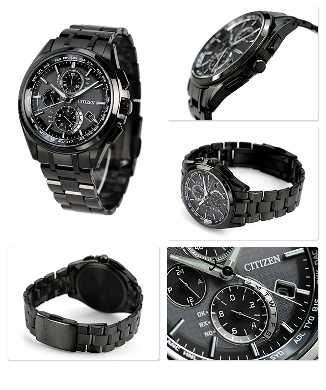 正規品 7年保証キャンペーン 送料無料 シチズン アテッサ クロノグラフ エコ・ドライブ 電波時計 メンズ ダイレクトフライト チタン オールブラック CITIZEN ATTESA AT8044-56E シチズンのプロダクトポリシー”技術と美の融合”が体現された次世代ウオッチ「アテッサ」。黒は、他から影響されない色、光を吸収する色。そんな黒色によって、何にも染まらない強い意志と、光を集める求心力を表現しました。黒色モデルだと本来形状を認識しにくいケースやバンドのディテールも、デュラテクトDLCの輝きにより感じ取ることができます。 ※DLCとは…ダイヤモンドのように硬いカーボンの硬質膜で素材をコーティングし、摩耗しにくい黒色の表面処理を施す技術。 ※※デュラテクトDLCとは…耐傷性に優れた美しい黒色を実現するシチズン独自の技術。デュラテクトDLCを施したチタニウムは金属アレルギーを起こしにくい素材です。 発売日:13年5月発売