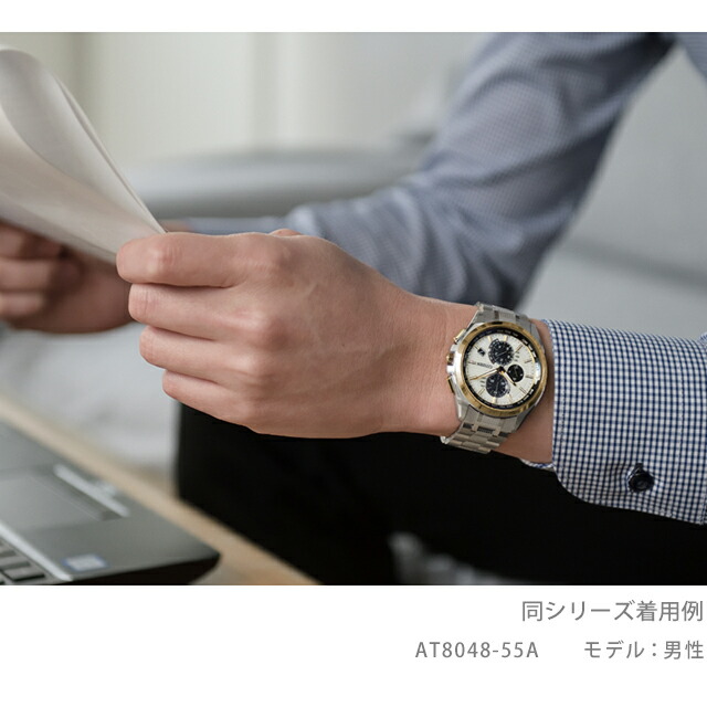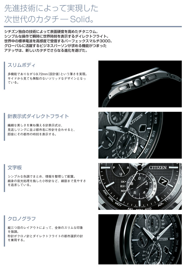 正規品 7年保証キャンペーン 送料無料 シチズン アテッサ エコ・ドライブ 電波時計 ダイレクトフライト メンズ CITIZEN ATTESA ブラック AT8040-57E シチズンのプロダクトポリシー”技術と美の融合”が体現された次世代ウオッチ「アテッサ」。独創的なデザインコンセプトで貫かれたスポーティ&エレガントなスタイリングに最先端テクノロジーが惜しみなく注ぎ込まれた先進のビジネスウオッチです。先進技術が生み出す次世代のカタチ-Solid(ソリッド)。シチズン独自の技術によって表面硬度を高めたチタニウム、ワールドタイム電波時計やシンプルな操作で瞬時に世界時刻を表示するダイレクトフライトなど多機能でありながら、新ムーブメント『H804』により、9.72mm という薄さと無駄のないSolidなデザインを実現しました。 また、「針表示式」のダイレクトフライトでは初となるクロノグラフ機能を搭載。シンプルに整頓されたスマートな文字板表現の中で、縦3つ目のクロノグラフが静かに放つ力強い表情は、時計に組み込まれた先進技術とともに、上昇志向を持つ都会的な大人の男性を満足させる仕様です。 発売日:2012年10月発売
