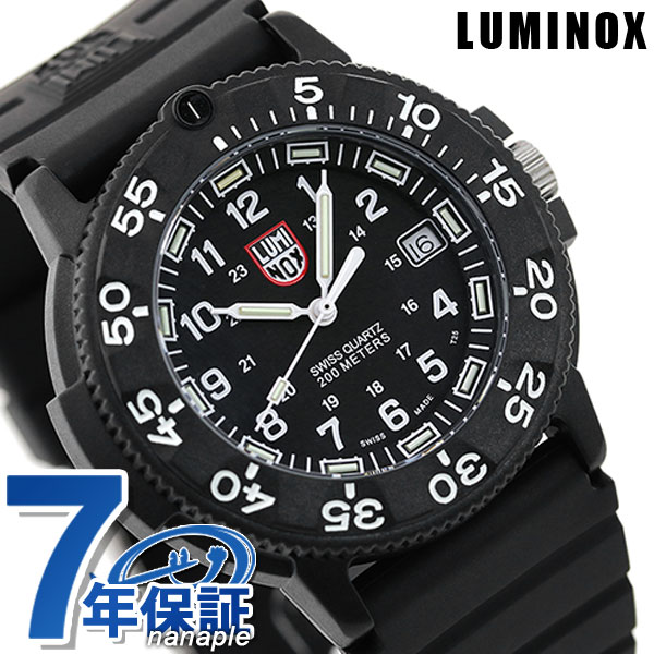 7年保証キャンペーン SEALsとの共同開発により、1994年に誕生した最初のモデル。ケースはポリエステルで強化されたカーボン製で、過激な作戦の際の破損を最小限に抑えるためにリュウズカバーが装備され、軽量かつ、頑強さを追求した。また、防水、耐圧性能を高めた2重のリュウズ構造を採用することで、20atm/200Mの防水性能を実現しています。 ルミノックス LUMINOX ネイビーシールズ ダイブウォッチ ブラック 3001