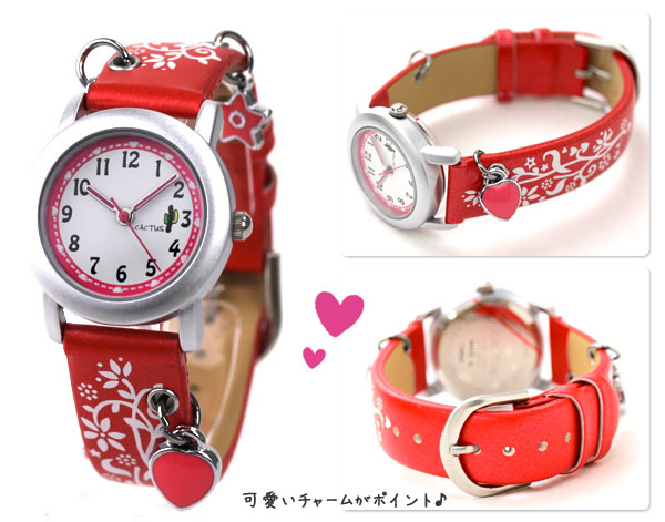 カクタス ハートチャーム クオーツ キッズ ガールズ 女の子 子供用 腕時計 CAC-28 CACTUS PUべルト ◆カクタスは子供の目線で企画された、オーストラリア発信のキッズウォッチのブランドです。カラーリング、デザインも子供たちが好きなものをたくさん取り入れワクワクする時計を数多くラインナップしています。おしゃれなアクリルケースに入ってますのでプレゼントにも喜ばれます。子供たちの世界感をイメージして作られたカクタスは世界中のたくさんの子供たちに人気の腕時計です。 光沢感のあるベルトにオシャレなチャームがついた可愛らしい時計です。 ブルー CAC-28-L04 レッド CAC-28-L07 パープル CAC-28-L09