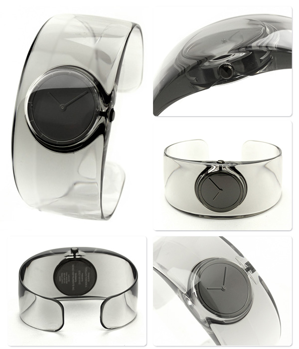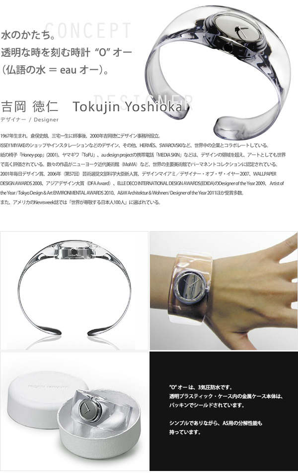 正規品 7年保証キャンペーン イッセイ ミヤケ ISSEY MIYAKE 腕時計 O オー 吉岡 徳仁 ブラック SILAW002 1970年にデザイン事務所を立ち上げ、今では世界的に有名な日本人ファッションデザイナー、三宅一生がプロデュースするウォッチブランド「ISSEY MIYAKE(イッセイ ミヤケ)」。 デザイナーの吉岡 徳仁(Tokujin Yoshioka)がフランス語で水(eau)を意味する「O(オー)」をコンセプトに手掛けるシリーズ。グリルアミドという弾圧性に長けた素材を採用した透明プラスチックに時計が埋め込まれたバングル型ウォッチです。シンプルで軽量なデザインなので、アクセサリーとしてもお使い頂けます。水に濡らすと溶けてなくなるリサイクル紙で作られた専用ボックスに入れてお届けします。