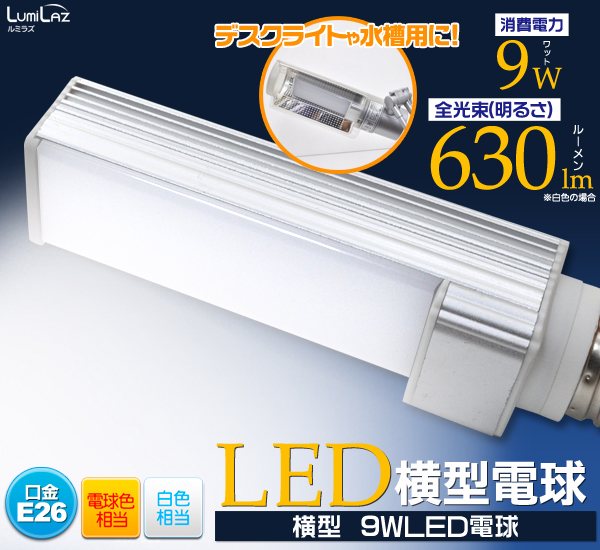 LED電球 口金E26 消費電力 9W 横型 LED 電球 LEDライト 照明 630lm 600lm 横挿し 横づけ 電球ライト 在庫処分価格 省エネ 節約 節電 ダウンライト デスクライト 水槽照明 アクアリウム デスク照明