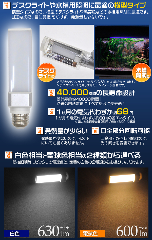 デスクライトや水槽用照明に最適の横型タイプ!横型タイプなので、横型のデスクライトや熱帯魚などの水槽用照明に最適です。 LEDなので目に負担をかけず、発熱量も少ないです。