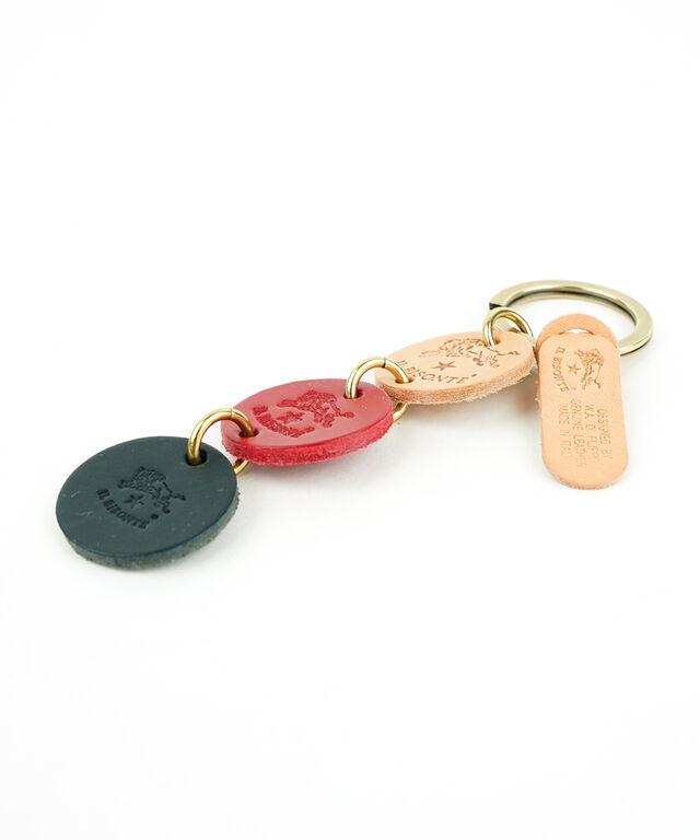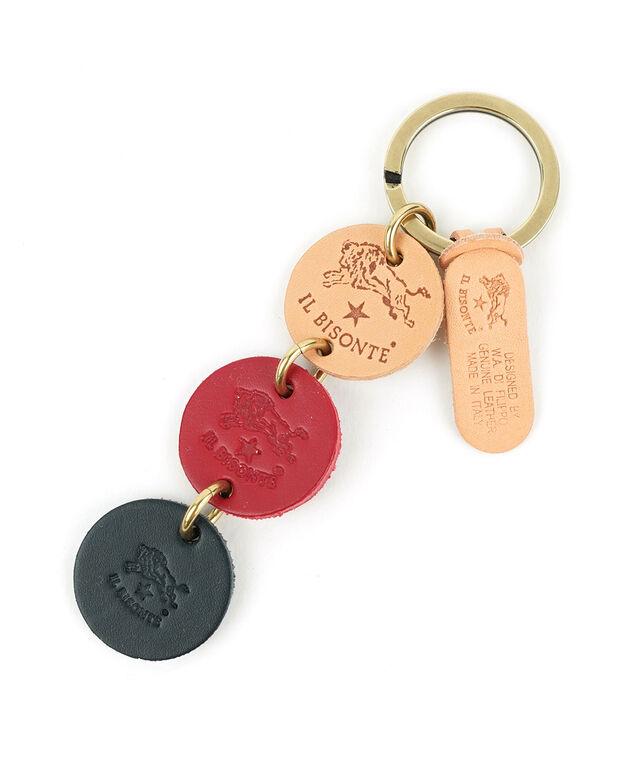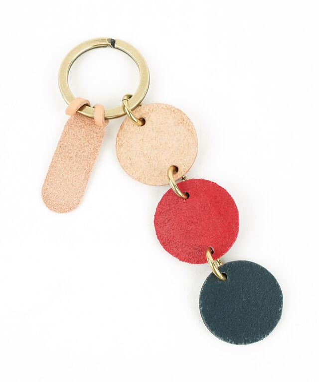 3色のレザーチャームがアクセントになったシンプルなキーリング。