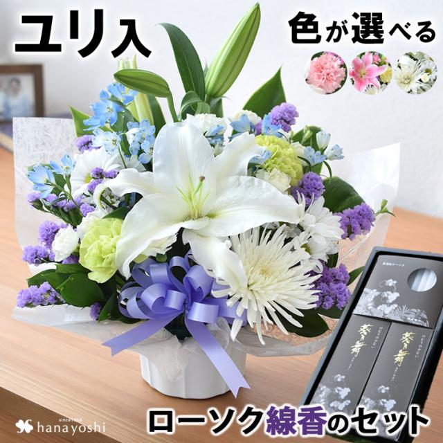 即日発送対応 お供え生花 フラワーアレンジメントS(ユリ入り)&ローソク・線香のセット お供え線香セット お供え お悔やみ 花 お線香 お供え物 喪中見舞い お供え花 初七日 四十九日 法要 お花 アレンジ 命日 供花 喪中 お見舞い 喪中はがきが届いたら 年賀欠礼