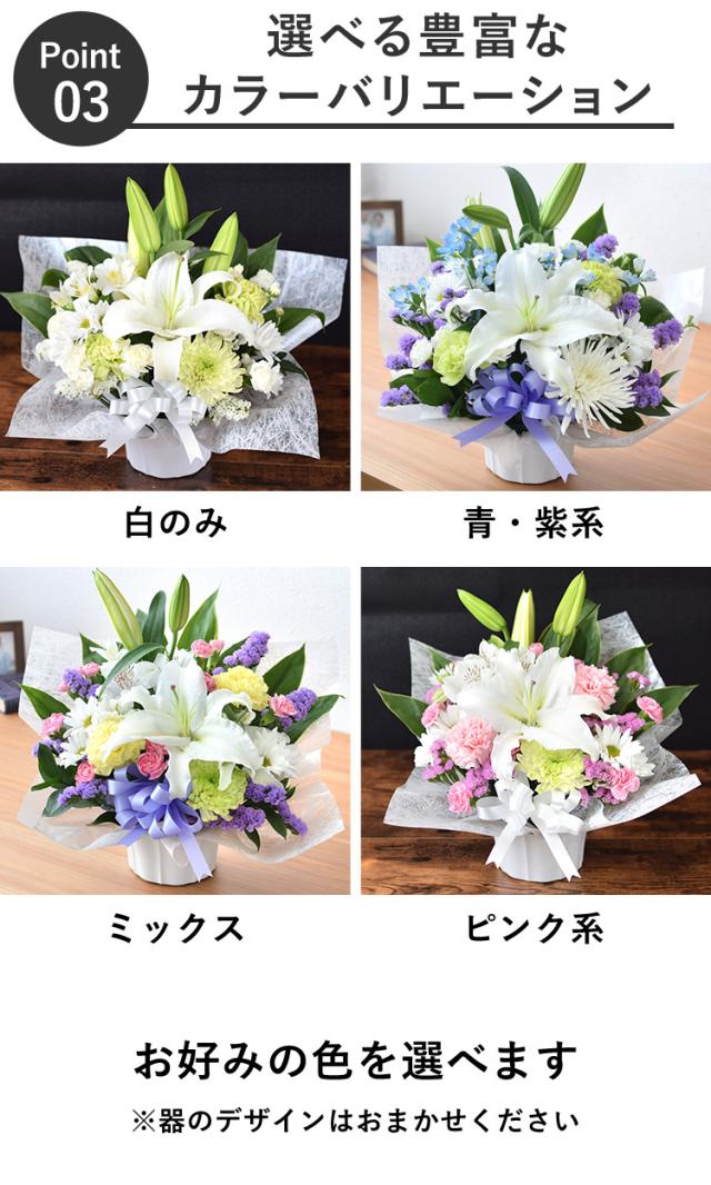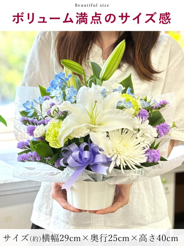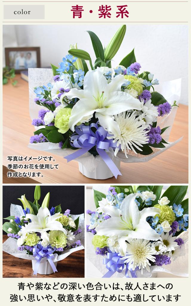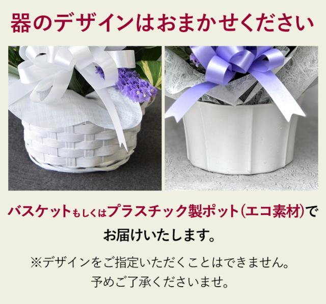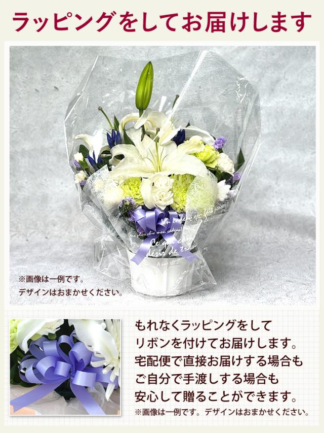 ●白+ブルーパープル、には、季節や入荷状況により、ブルー、またはパープルの花については、いずれかのお色になる場合があります。