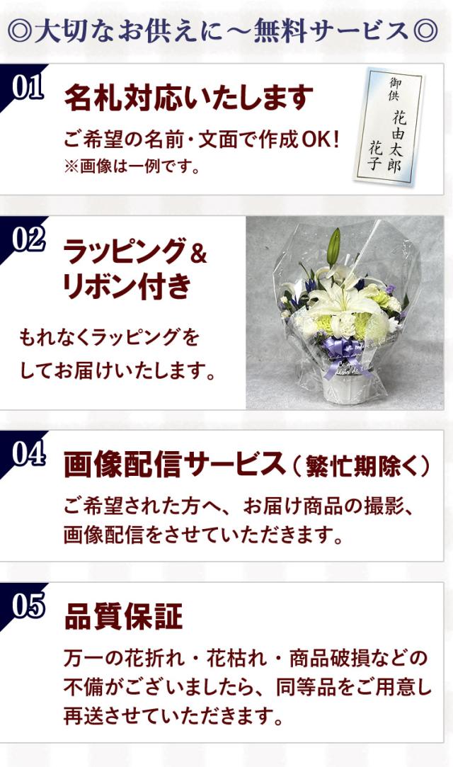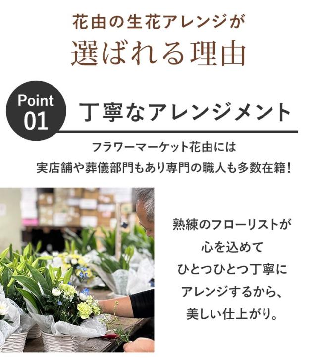 - 白色のお花を注文しました。 ご近所へ持参するため自宅へ送って頂きましたが、梱包はとても丁寧で、お花は写真通りの豪華さで感動しました。 大きなユリ3つは蕾の状態で生けて下さっていて、「御供」「名前」の名...