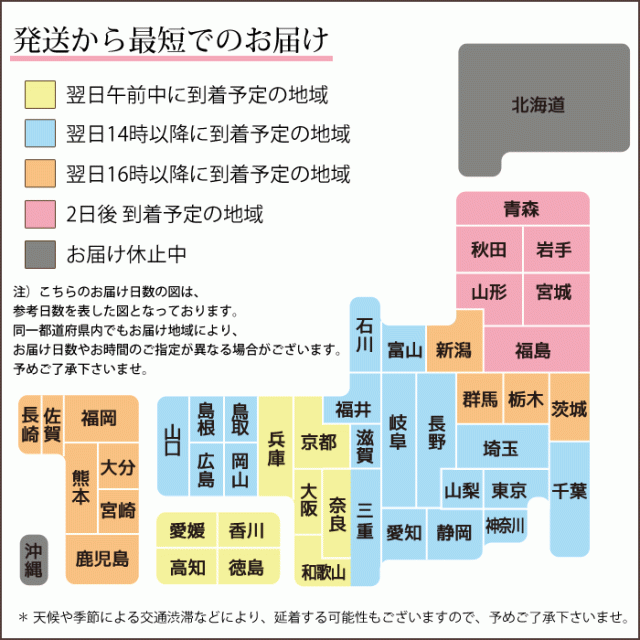 しめきりまでのご注文で、当日出荷の翌日、翌々日にお届けいたします。