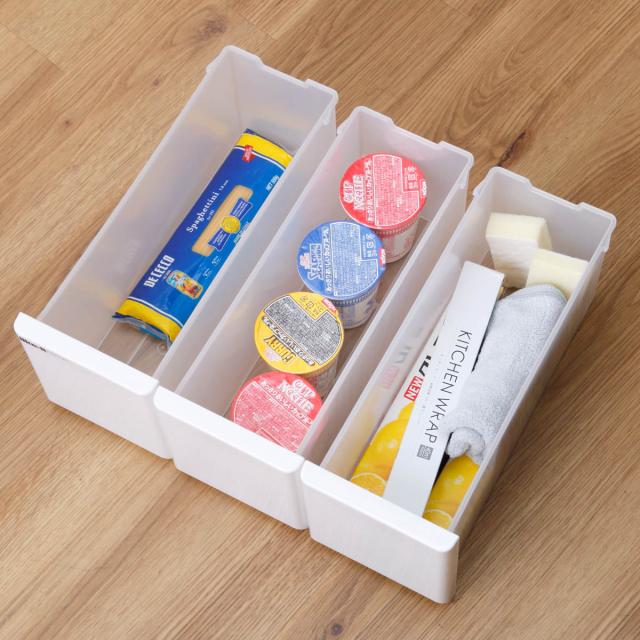 引き出しには、レトルト食品の箱や袋麺などを収納できます。食品以外にも、ペーパーナプキンなどのキッチン小物、ふきんやスポンジなどの清掃用品のストック置きとしてもおすすめです。