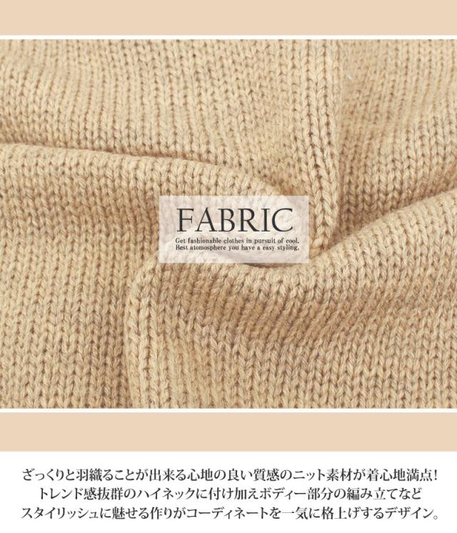 トレンド感抜群のハイネックに加えボディー部分の編み立てなどスタイリッシュに魅せる作りがコーディネートを一気に格上げするデザインになっています。