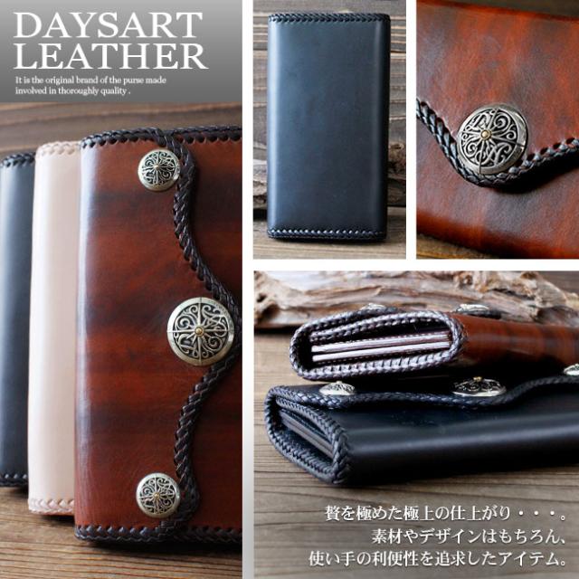 企画から製作まで完全オリジナル!革は上質なサドルレザーを使用し、コンチョにはデイズアートオリジナルデザインのホワイトメタル製コンチョを使用!贅沢で高級感のある財布に仕上がりました。デザインもさることながら、使い勝手にもとことん拘り、見た目と機能性を両立させています。