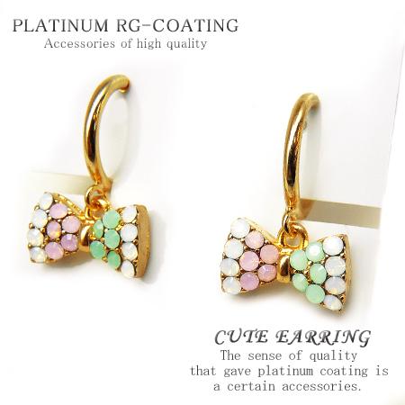 ゆらゆら揺れるリボン型フープイヤリング パーティー 結婚式 プレゼント レディース ゴールド CZダイヤ ピンク【 fp199 】