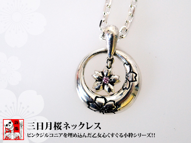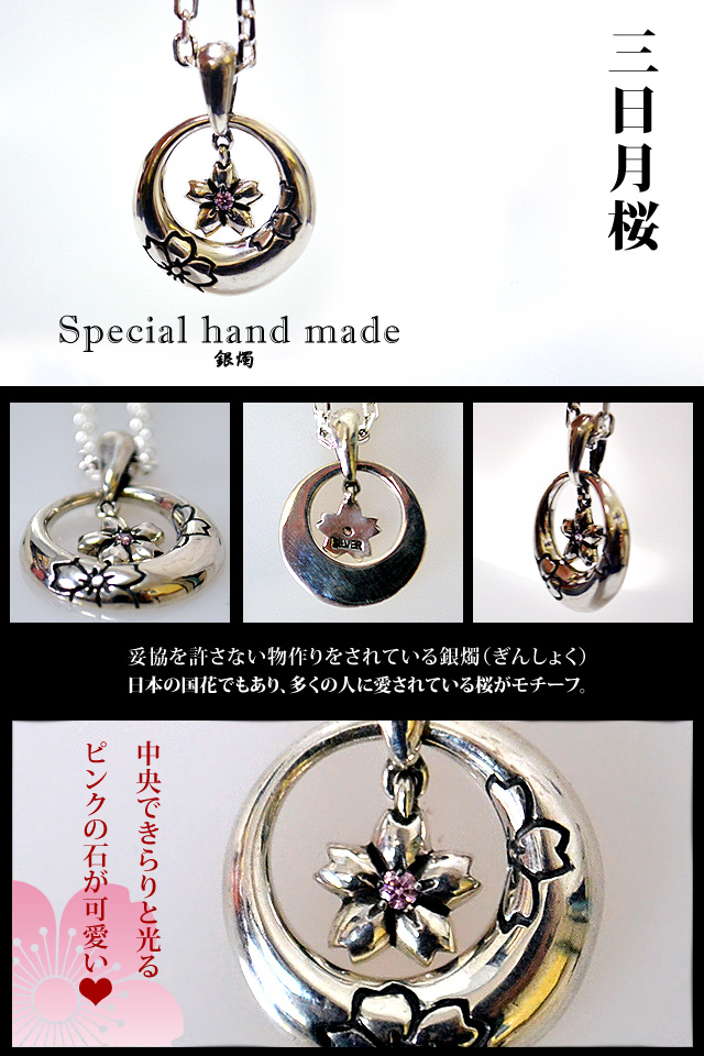 丁寧な彫り込み、妥協を許さない物作りをされている銀燭(ぎんしょく)さんより、「三日月桜ネックレス」のご紹介です! 女性用らしく、桜の中央にはピンクジルコニアがうめこまれています。 ※一点一点手作りの為、在庫が無い場合は2週間前後見ていただければ仕上がります。 | ||||||