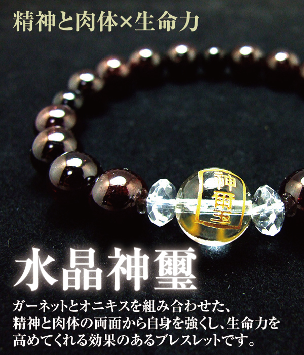 トップに水晶(神璽と白崎八幡宮の印字)金彫りを使用し、ガーネットとオニキスを組み合わせた、精神と肉体の両面から自身を強くし、生命力を高めてくれる効果のあるブレスレットです。鎌倉時代(1250年)より続く岩国鎮座の神社 白崎八幡宮の大神様のご神徳をお頒ちし、神職が神様と願主様の仲取り持ちとして心身健康・生命力増大祈願をご奉仕しております。※「神璽」とは神さまの印のことです。