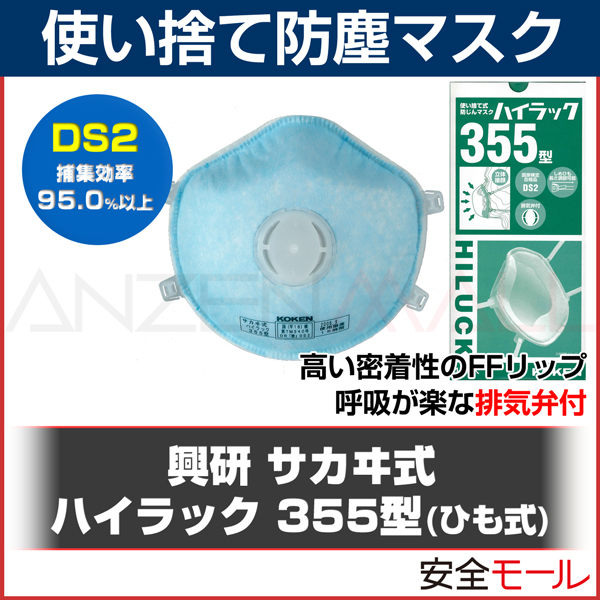 【PM2.5/大気汚染/黄砂対策】 【興研】 使い捨て式 防塵マスク ハイラック355 2本ひも式 (10枚入) (DS2) 【粉塵/作業用/医療用】
