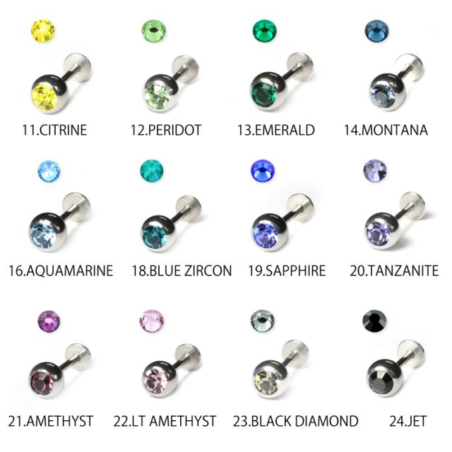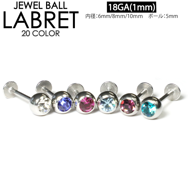 【メール便対応】ボディピアス ラブレット18G(1mm) スタッド ジュエルボール5mm玉 20色 サージカルステンレス カラーラインストーン ボディーピアス 定番 口ピアス 18ゲージ ┃