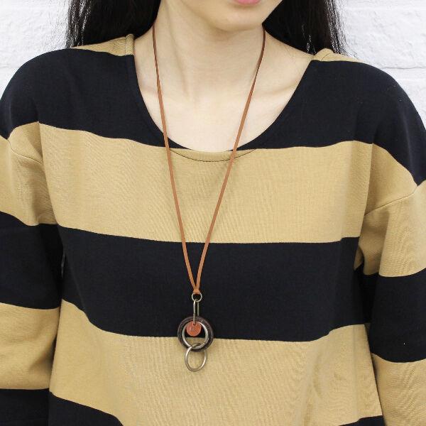 ヴィンテージ感のあるレザーリングとアンティーク調の真鍮リングが胸元を飾ってくれます。