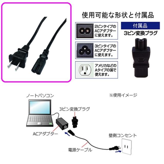 ●Dell、HPなど海外メーカーのパソコンにも対応している3ピンプラグ付き(このケーブルでは電圧の変換はできません。