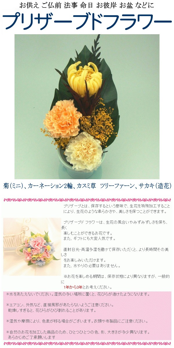 菊(ミニ)、カーネーション2輪、カスミ草 ツリーファーン、サカキ(造花)、本体寸法:125×128(折り曲げ可能ステム140)/mmを白箱に入れてお届けします。 花の色・種類等、多少変更する場合がございます。メーカーから直送の為、他の商品と同梱は一切できません。ご注文からお届けまで最大1週間程度必要な場合がございますので、ご希望日にお届けできない場合がございます。商品代引きでのお支払いはできません。