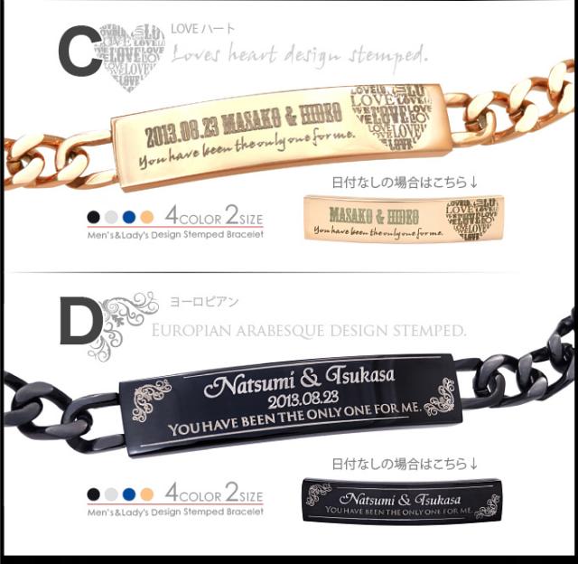 ネームと記念日を刻印できるオーダーメイドステンレス喜平ブレスレットです。選べる4種類のデザインが普通のIDブレスレットとは違う高級感とデザイン性の高いステンレスブレスレットです。サイズは、メンズとレディースの2サイズカラーは、ブルー・シルバー・ピンクゴールド・ブラックの4色をご用意しました。お友達や恋人など、大事な人へのプレゼントにもちょうどいい、オーダーメイドブレスレットであなたのハイセンスを魅せてください。【レディース】全長:17.5cm 腕周り:約15.5cm前後 幅:0.82cm 重さ:約14g【メンズ】全長:19cm 腕周り:約17cm前後 幅:0.82cm 重さ:約14.8g■ステンレス素材(コーティング)≪c-code≫ ブラック/ピンクゴールド/ブルー●●●注意事項●●●・単品販売(1個売り)です。・ペアのご注文は2個購入して下さい。・キャンセルおよび刻印内容の変更不可・刻印内容(名前と日付)を記入する備考欄は決済画面の最後【この内容で購入する】という表示の下の方にあります。忘れないように必ず記入してください。