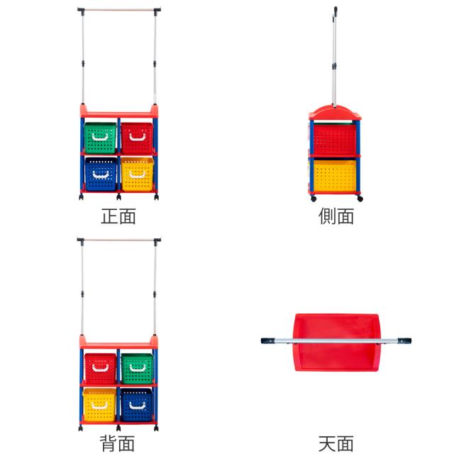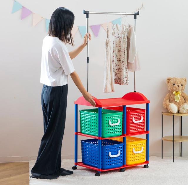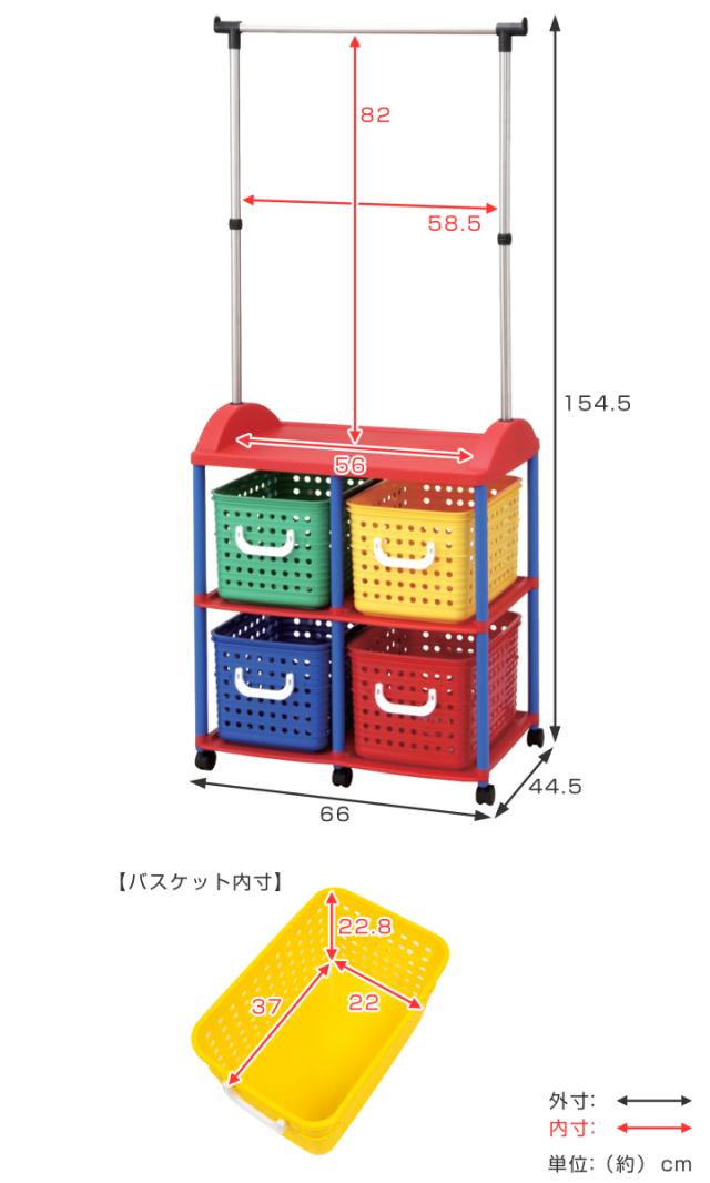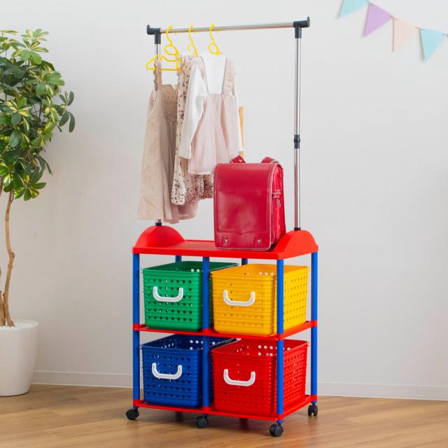 ハンガーラック 幅66cm 2段 キッズ収納 バスケット 4個付き ( ランドセルラック 洋服掛け おもちゃ箱 オモチャ入れ 収納 パイプハンガー 簡単組立 ポールハンガー 大容量 ラック 衣類 引き出し キャスター付き プラスチック製 子供 )