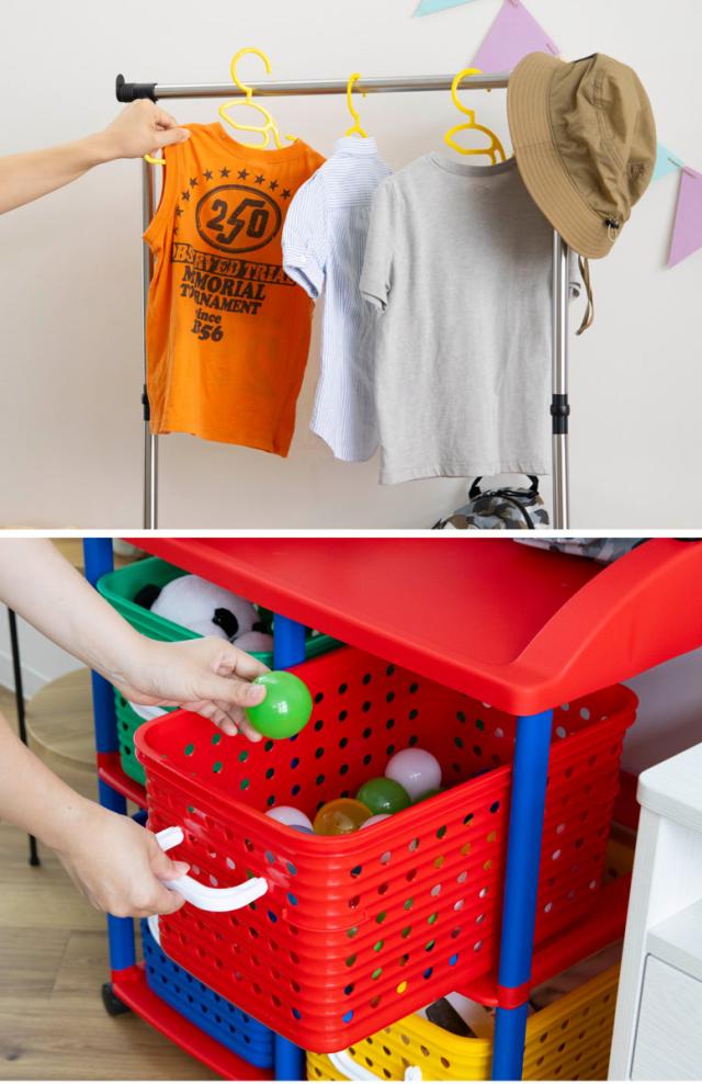 「洋服はハンガーに掛ける」「カバンや帽子は引っ掛ける」「おもちゃはバスケットにしまう」など、パイプハンガーラックは、お子様のお片付け習慣をサポートします。カラフルなバスケット収納は、色で分けて収納するものを決められるので、小さなお子様でも覚えやすく、ゲーム感覚で楽しくお片付けの習慣が身に付きます。