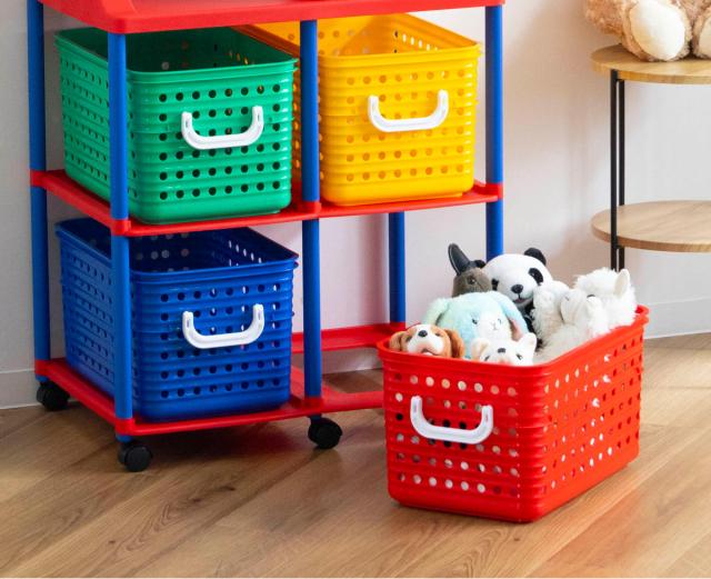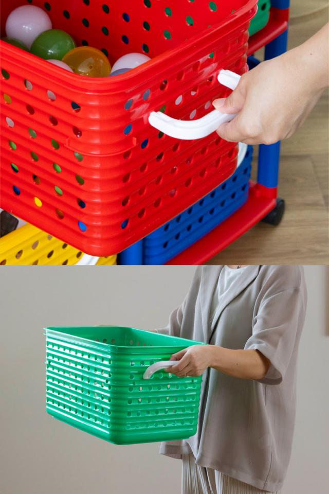 フタのないシンプルな形状のバスケットは、お子様が自分でおもちゃを片付けやすくなっています。