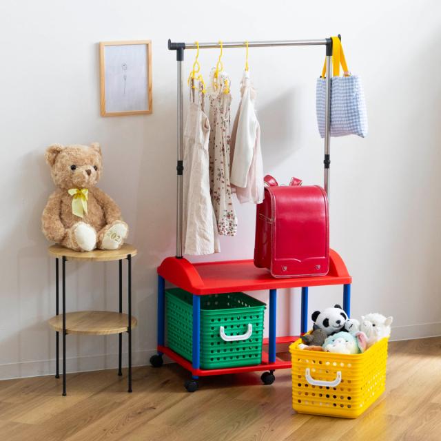 「洋服はハンガーに掛ける」「カバンや帽子は引っ掛ける」「おもちゃはバスケットにしまう」など、パイプハンガーラックは、お子様のお片付け習慣をサポートします。カラフルなバスケット収納は、色で分けて収納するものを決められるので、小さなお子様でも覚えやすく、ゲーム感覚で楽しくお片付けの習慣が身に付きます。