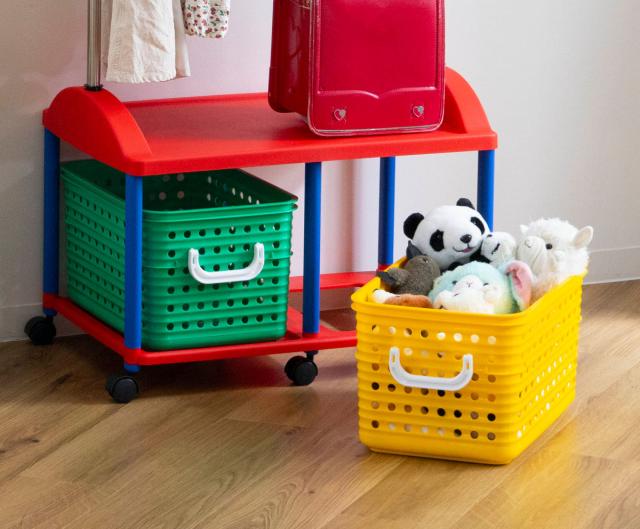 フタのないシンプルな形状のバスケットは、お子様が自分でおもちゃを片付けやすくなっています。