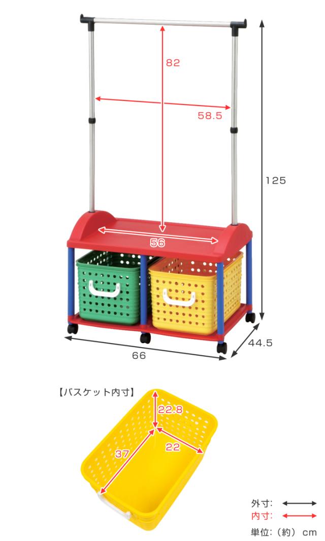 ハンガーラック 幅66cm キッズ収納 バスケット 2個付き ( ランドセルラック 洋服掛け おもちゃ箱 オモチャ入れ 収納 ポールハンガー 簡単組立 ラック 衣類 引き出し キャスター付き プラスチック製 子供 かご パイプハンガー )