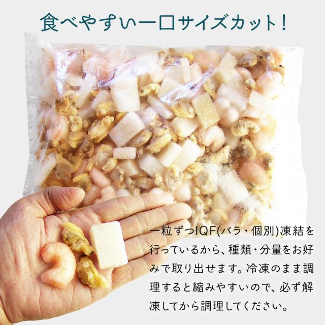 | 商品詳細 | 下拵え不要で時短調理に便利なシーフードミックス。すぐ調理できるようカット・下処理済みの具材を、一粒ずつIQF凍結(バラ凍結・個別凍結)しているから、必要な分量だけ一粒ずつ取り出して調理できます。 |