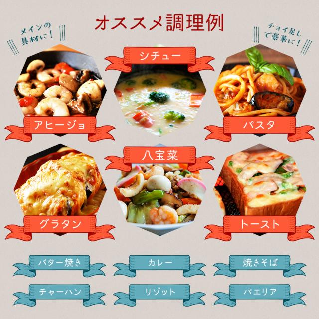 | 調理方法 | 冷凍のまま加熱してお召し上がりください。冷凍状態が気になる場合は氷水に浸すか、冷蔵庫でゆっくり解凍すると、臭みが出にくく美味しく調理できます。常温解凍は旨味が溶け出しやすく、湯煎解凍、レンジ解凍は風味を損なう恐れがあります。グラタン、シチュー、パスタ等の定番洋食はもちろん、八宝菜、炊き込みご飯、アヒージョ等アレンジ自由自在!和洋中いろいろなお料理にお役立てください。 |