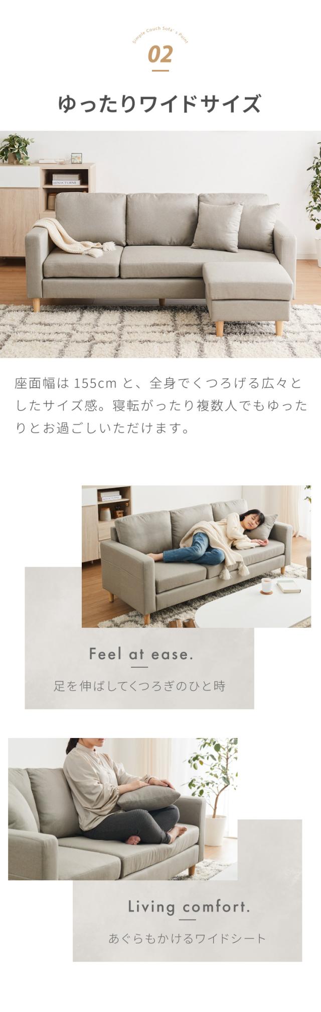 無駄のないシンプルなデザインで、どんなインテリアにも馴染みやすいカウチソファ。ゆとりのある座面は様々なくつろぎ方ができ、好みやシーンに合わせたレイアウトも楽しめます。