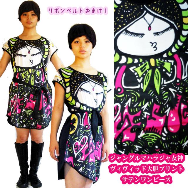 セールにゃんこスター棟方志功風和柄ワンピース版画ポップアートマハラジャ女神ヴィヴィッド大胆プリントサテンチュニック