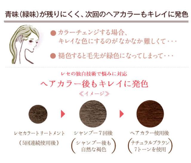 レセの独自技術により、ありがちな青味(緑味)が残りにくく、シャンプー後も自然に褪色し、 次回のヘアカラーもキレイに発色します。