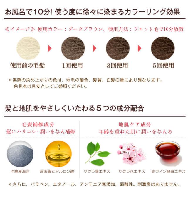 髪と地肌をやさしくいたわり、使うたびに徐々に染まるカラーリング効果で、美しく自然な髪色に導くカラートリートメント(男女兼用)。